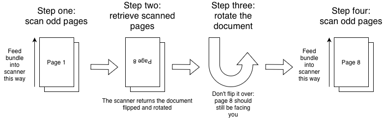 I’ve created a tool, named Wrong Side Up, that will fix page ordering when scanning like this. Download the latest version by visiting https://github.com/danielphil/wrongsideup/releases/latest and clicking on WrongSideUp.zip to download the zip file containing the program. Download the file and decompress it to get the app. Note: The app isn’t signed or notarized so you’ll need to bypass Gatekeeper to run it. Feel free to grab the source instead and set up the Python environment if you’d prefer not to use the application file I built.