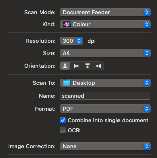 Scan Mode: Document FeederName: set to the name of the PDF file you want to createFormat: PDFCombine into single document: make sure this is checked