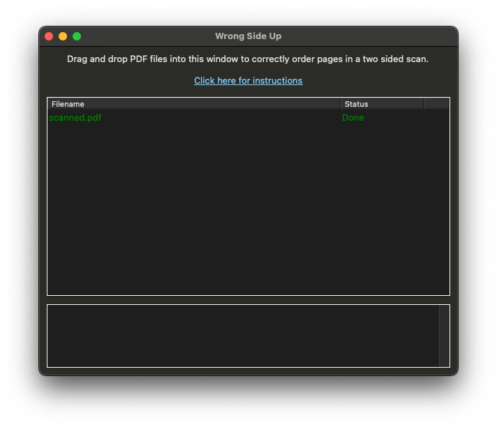 To use the application, drag and drop the PDF files you scanned into the application window. The application will load the PDF file, reorder the pages and then overwrite the original file with the page order corrected (make sure to backup anything important if necessary). You can drag multiple files into the app and it’ll process them all at once. Error messages will appear in the box at the bottom of the window if there’s any failures with handling a file. Click the close button when you’re done with the app.